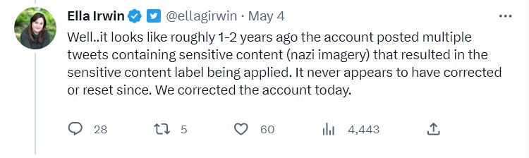 Clearly, the account did not “post multiple tweets containing sensitive content (nazi imagery) that resulted in the sensitive content label being applied,” because Twitter has now removed the fake, defamatory “adult content” labels from those Tweets, which contain the same “Nazi imagery” they originally contained. As I am sure you have noted, the so-called “Nazi imagery” contained in those Tweets was simply historical photos of the Nazi Germany era, which were used to illustrate critical points I was making in opposition to totalitarianism, and not at all any type of celebration or approval of totalitarianism or fascism. Any rational adult, seeing those Tweets, could not possibly mistake the anti-fascist/totalitarian intent behind them. Also, the fact that the fake, defamatory “adult content” labels are being removed gradually, in stages, rather than all at once, suggests that the application of the fake labels (or “interstitials”) in question was not the result of a blanket algorithm applied to the account. Additionally, not every Tweet (or every Tweet containing an image) by this account was censored with a fake "interstitial," which suggests that something other than a blanket algorithm was at work.