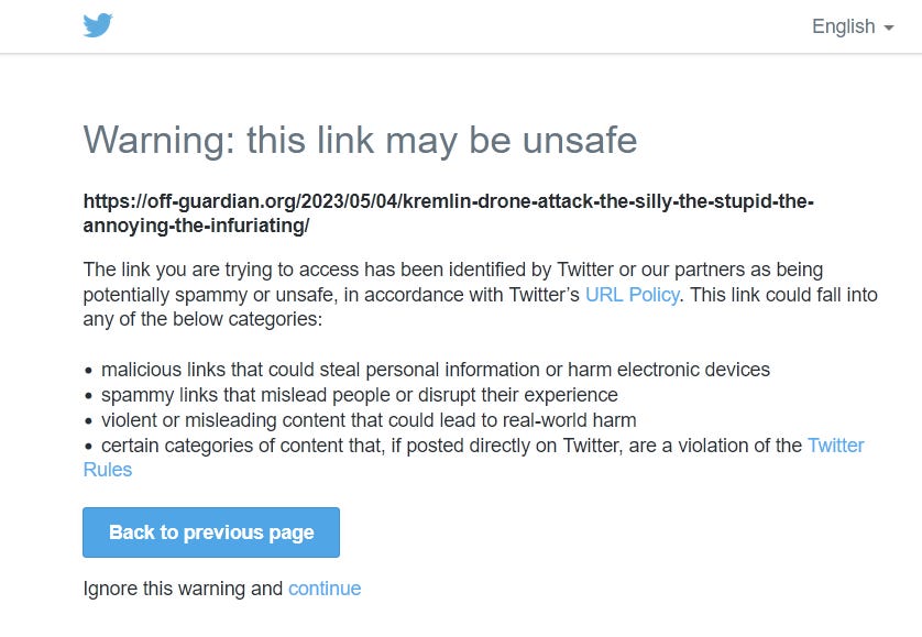 There is nothing “unsafe” about OffGuardian, or any content published on the website that could possibly “lead to real-world harm.” It is a small, independent news and commentary outlet. Twitter, Inc. is using the fake “interstitial” warning above to discourage users from visiting the site, and thus damaging OffGuardian’s reputation and income. This is just one further example (i.e., in addition to my case). Twitter’s continued use of fake, defamatory, “interstitial” labels to suppress political views is relatively widespread, as far as I can tell. Moreover, recent updates to Twitter’s Platform Use Guidelines make it clear that Twitter intends to continue using these “interstitials,” which is worrying, given the fact that the company has been using them to deceive people, and to suppress political speech, and to damage the reputations and incomes of small businesses and sole proprietors.