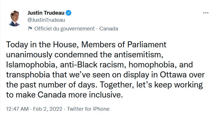 Now, this is the actual prime minister of Canada, not just some woke fanatic on Twitter. He was tweeting from his fortified Covid Bunker in an undisclosed location somewhere in the Yukon, or possibly the United States, where he fled as the transphobic Putin-Nazi truckers rolled up outside his office in Ottawa. Trudeau had vowed to stand and fight, but he had no choice but to flee the capital after he mysteriously tested positive for Covid (which also might have been the work of the Russians, possibly the same professional team of weed-smoking, hooker-banging Novichok assassins that got to the Skripals back in 2018).