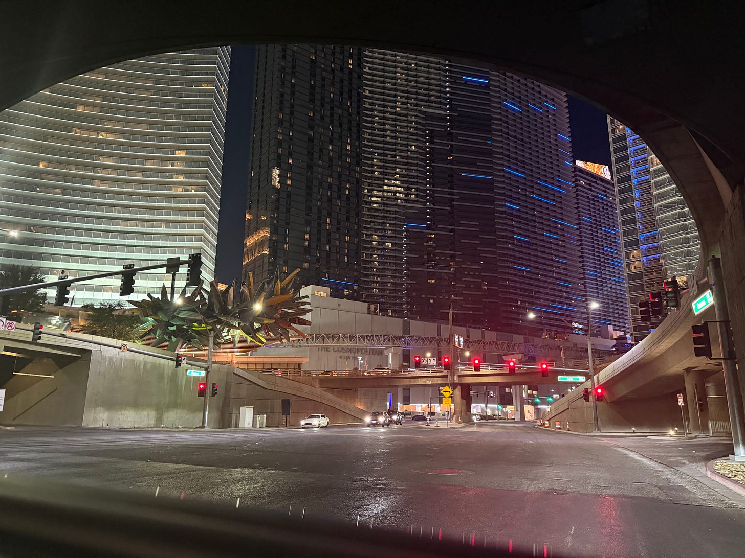 So, there we were, in this total shithole crackhouse/hooker motel down by the airport, dangerously exhausted, having just fled the lovely home in the hills we had planned to recuperate in for the next three days. Our nerves were shot. There was really only one thing left to do. I booked us a room on the strip in Vegas, which is where I am writing from now. Here’s a shot Hugo took as we rolled into town on Monday …