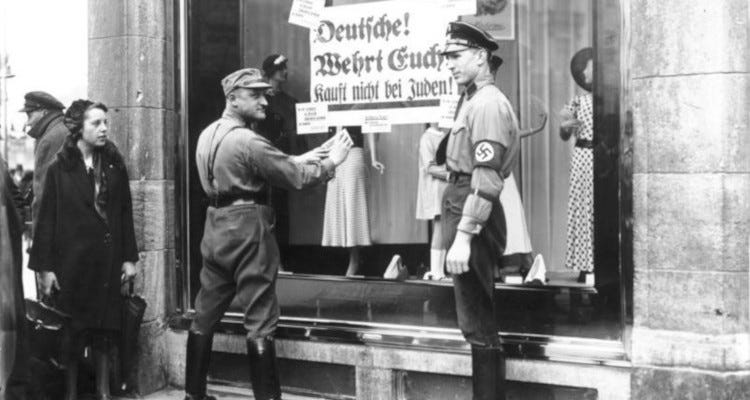 On April 1, 1933, shortly after Hitler was appointed chancellor, the Nazis staged a boycott of Jewish businesses in Germany. Members of the Storm Troopers (“die Sturmabteilung,” or the “Storm Department,” as I like to think of them) stood around outside of Jewish-owned stores with Gothic-lettered placards reading “Germans! Defend yourselves! Do not buy from Jews!” The boycott itself was a total disaster — most Germans ignored it and just went on with their lives — but it was the beginning of the official persecution of the Jews and totalitarianism in Nazi Germany.
