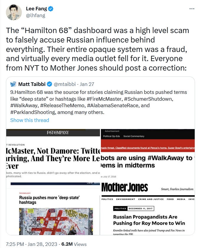 Again, Fang’s tweet has nothing to do with the Covid-PSYOP or the “Covid Twitter Files.” It’s just an example of how the system works. Even in the “Hamilton 68” story, there are certain lines that cannot be crossed. The corporate and state media and so-called “papers of record” can be portrayed as “dumb,” “sloppy,” “incompetent,” and even “unethical” and “driven by greed,” but they cannot be portrayed as the propaganda apparatus of a supranational global capitalist system, an apparatus that is functioning perfectly, because that would sound like a “conspiracy theory.”