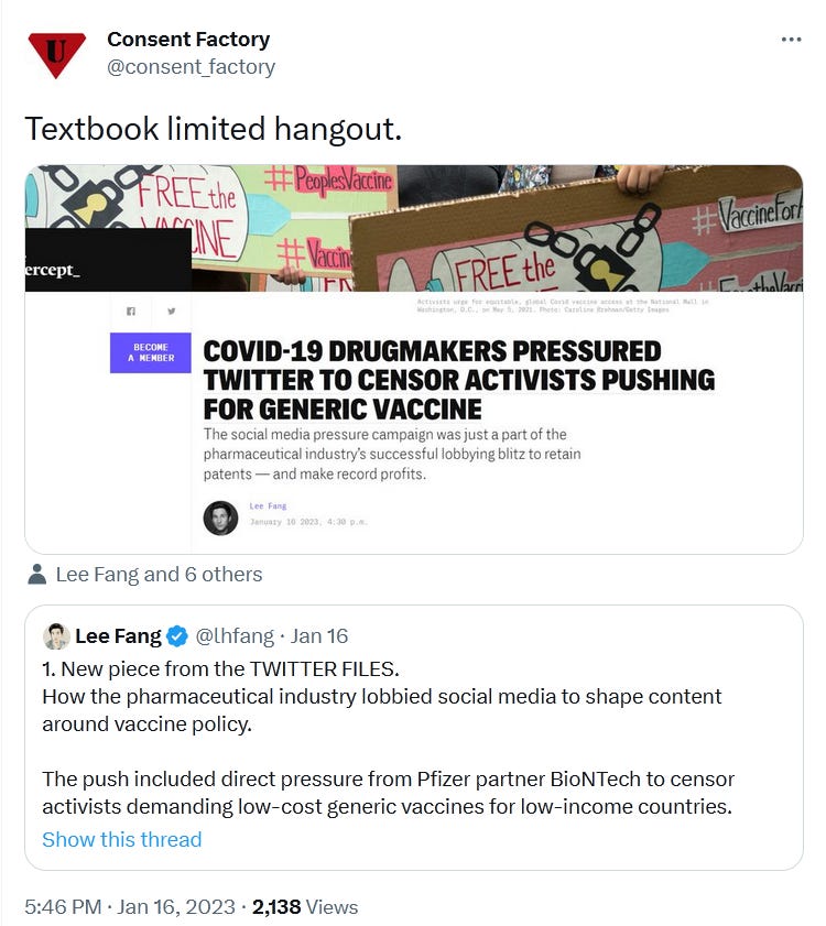 Journalists like Lee Fang, Alex Berenson, and even Glenn Greenwald — whom I like and respect — are the perfect vehicles for limited hangouts. They have the requisite “outsider” credentials while still being members of George Carlin’s “big club” (or maybe just “associate members” … a few million dollars isn’t what it used to be).