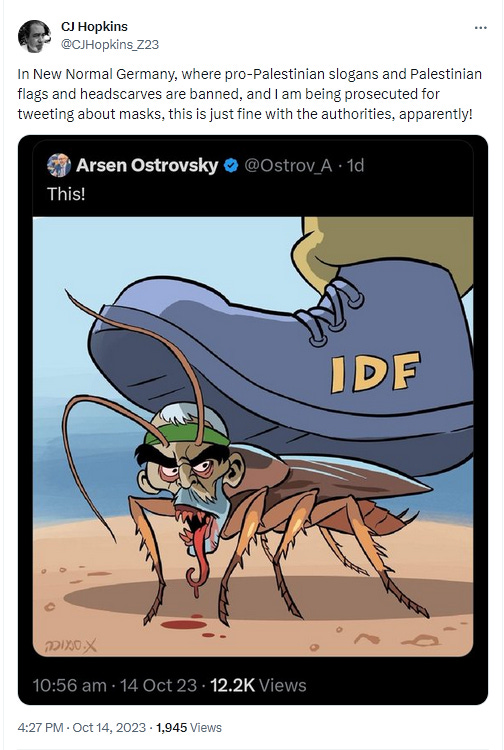 In the meantime, everything is going by the numbers. The nations of the New Normal Reich are marching in lockstep. This is “Israel’s 9/11.” Democracy is at war with “evil” again! The demonization and criminalization of dissent that was rolled out during the “Covid pandemic” in 2020-2022 has gone into overdrive. Germany, France, and other countries have banned demonstrations expressing support for the Palestinians. Here in Berlin, police are roaming the streets, harassing and arresting Arab-looking kids, and anyone improperly criticizing Israel. Anti-Israel social-media content is being censored and visibility-filtered, while fascist content like this gets a pass …
