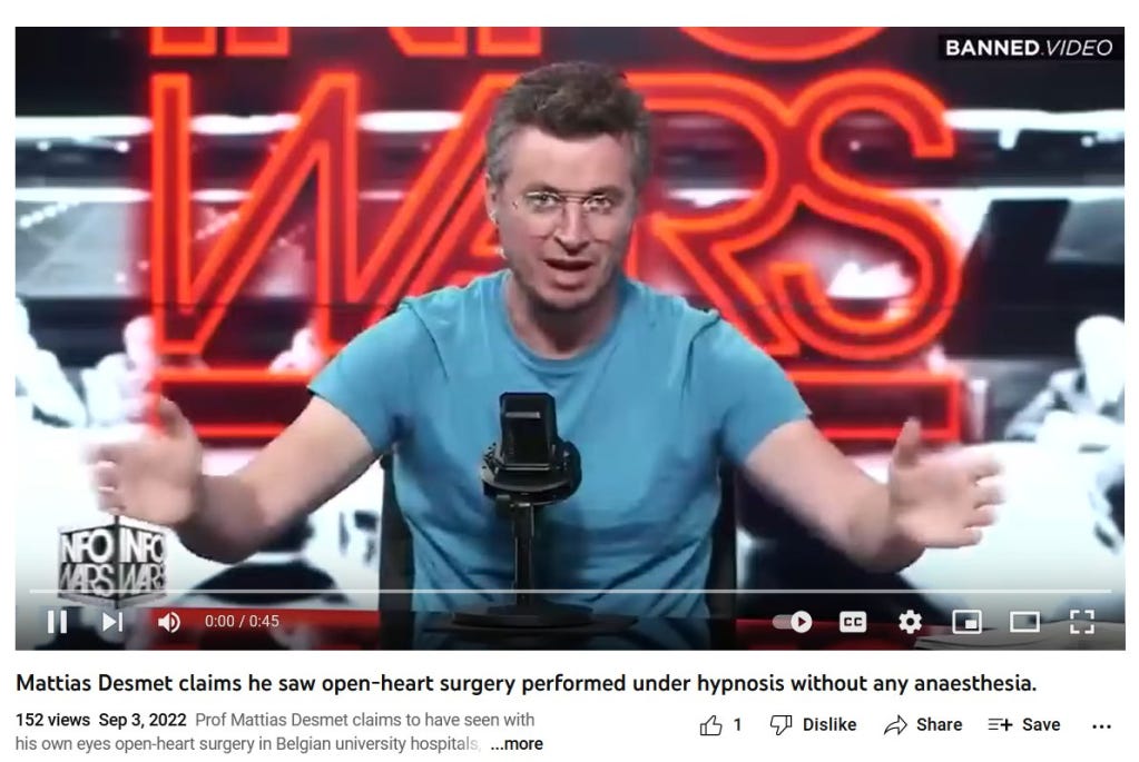 Addendum, September 12, 2022 — It appears Professor Desmet has been telling the “doctors performing open-heart surgery on hypnotized patients with no anesthesia” lie for some time, or at least trying to. This video is purportedly from 2020. An English translation, provided by a Dutch colleague, is below.