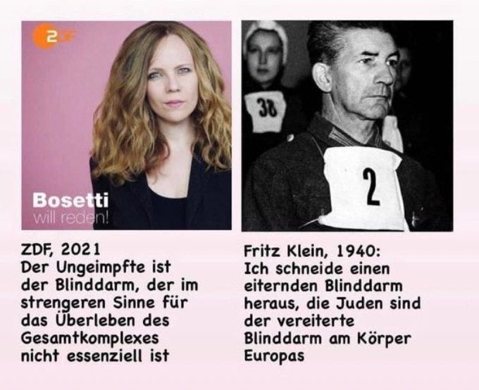 Come to think of it, the Inquiry Commission might also want to look into how the German authorities, and the overwhelming majority of the state and corporate media, accidentally systematically fomented mass hatred of anyone who dared to question the government’s arbitrary and nonsensical decrees or who refused to submit to “vaccination,” and publicly demonized us as “Corona deniers,” “conspiracy theorists,” “anti-vaxxers,” “far-right anti-Semites,” etc., to the point where mainstream German celebrities like Sarah Bosetti were literally describing us as the inessential “appendix” in the body of the nation, quoting an infamous Nazi almost verbatim.