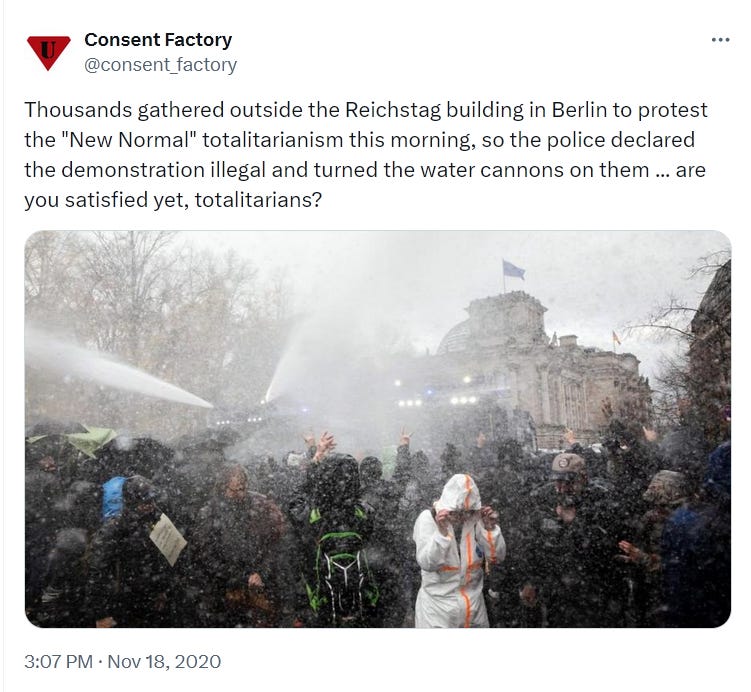 Another thing the Commission will probably want to look into is how the German authorities accidentally banned any further demonstrations against their arbitrary decrees, and ordered the police to brutalize anyone participating in such “illegal demonstrations.”