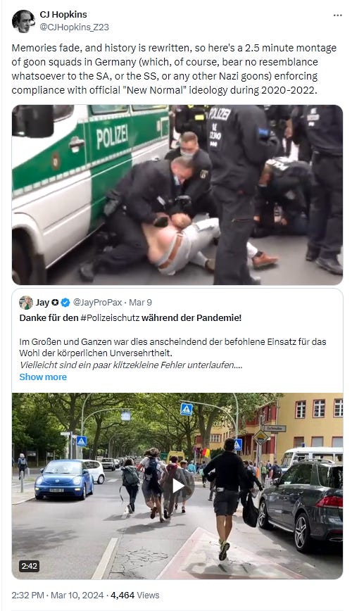 No, this is definitely not the German authorities staging a public “accountability” spectacle in order to memory-hole what happened during 2020-2023 and enshrine the official narrative in history. There’s going to be a formal “Inquiry Commission” — conducted by the same German authorities that managed the “crisis” — which will get to the bottom of all the regrettable but completely understandable “mistakes” that were made in the heat of the heroic battle against The Divisive Virus!