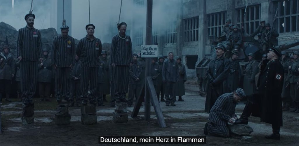 And here’s a frame from Rammstein’s music video, Deutschland, in which the Rammstein guys dress up like both Nazis and concentration camp prisoners, which is also not “propaganda, the contents of which are intended to further the aims of a former National Socialist organization.”