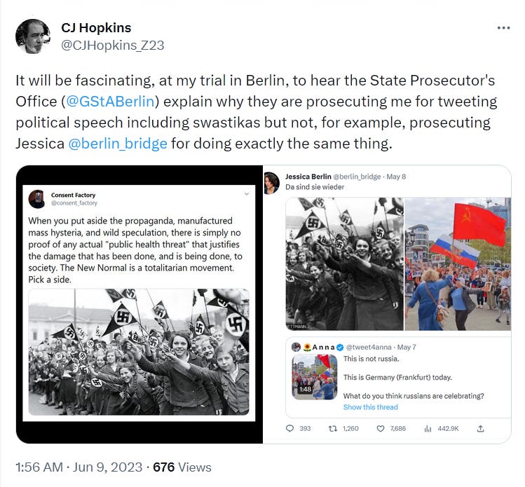 The German authorities understand this. They’re not total idiots. They attended universities. Some of them studied political science, and logic, and even 20th-Century history. They know the difference between pro-Nazi propaganda and anti-totalitarian artwork. They know how absurd the charges against me are, but they have to be pursued, because … well, orders are orders!