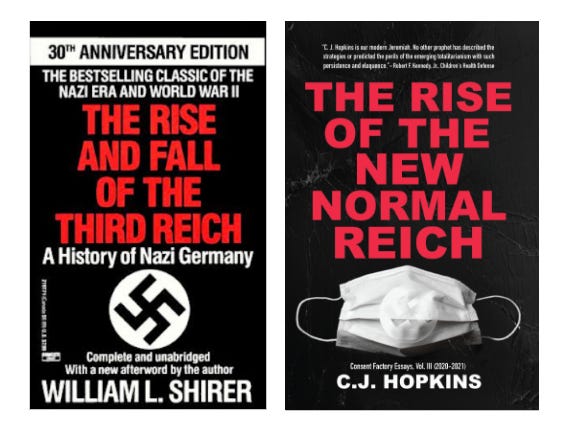 Which is totally reasonable. After all, Nazi Germany was not just one type of totalitarian social system among others, like Maoist China, Fascist Italy, the USSR under Stalin, the Khmer Rouge in Cambodia, and other totalitarian social systems that you’re allowed to compare New Normal Germany to. And, even if it was (i.e., one example of totalitarianism, among others, and not the incomparably singular and utterly unprecedented historical event that it was), there is no such thing as totalitarianism anymore, so you can’t compare any present-day system, or movement, or widespread sociopolitical phenomenon, to it (i.e., to Nazi Germany), or to any of those other totalitarian systems, especially not in New Normal Germany.