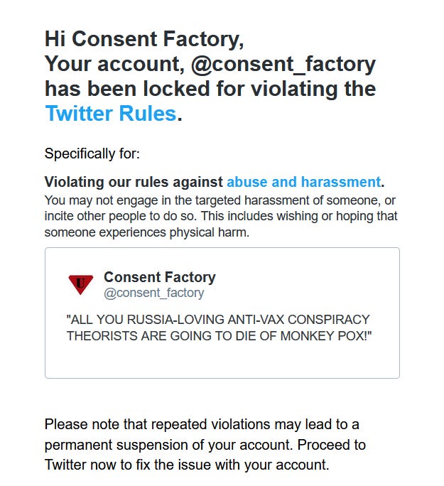 At this point, I’ve lost track of the number of times the Consent Factory account and my own account have been “locked down” for “spreading misinformation” or “abuse and harassment” since the Spring of 2020, but it sure feels like my “unpersoning” is imminent.