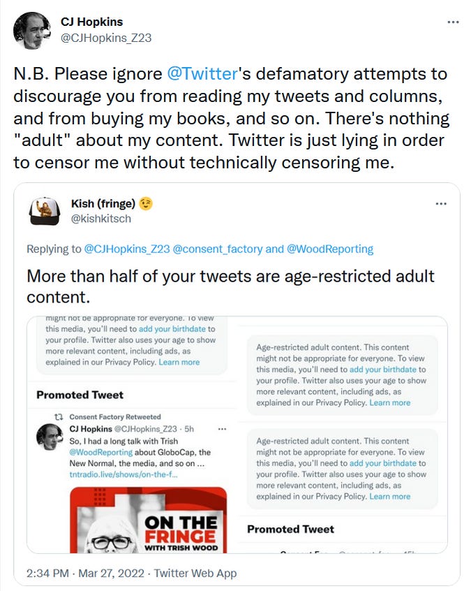 Which is a long way of saying, if you follow me or the Consent Factory on Twitter or Facebook, and we suddenly disappear one day, go ahead and assume that we have been “unpersoned.” If that happens, I’ll still be here on Substack and I might have to go out and buy a phone so that I can sign up for a Telegram account.
