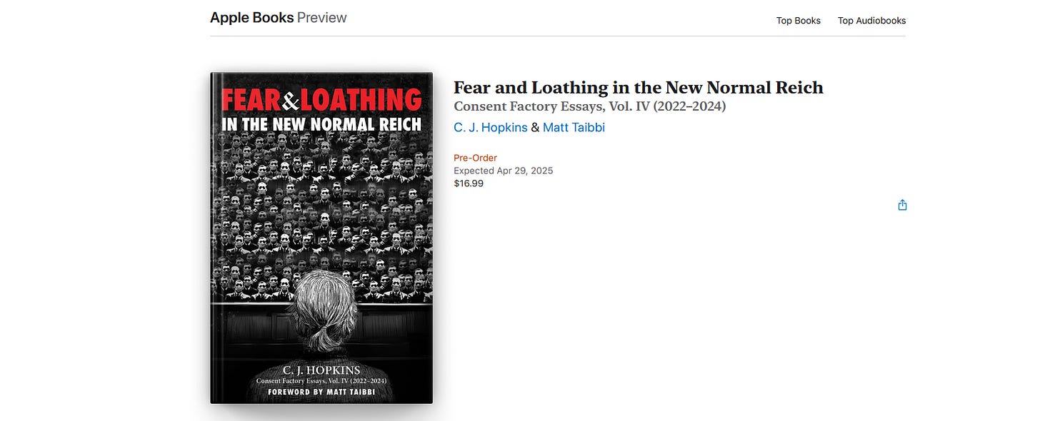 My latest collection of Consent Factory Essays, Fear and Loathing in the New Normal Reich, will be released next Tuesday, April 29. This will slightly piss off the German Thought Police. But I want to thoroughly piss off the German Thought Police.