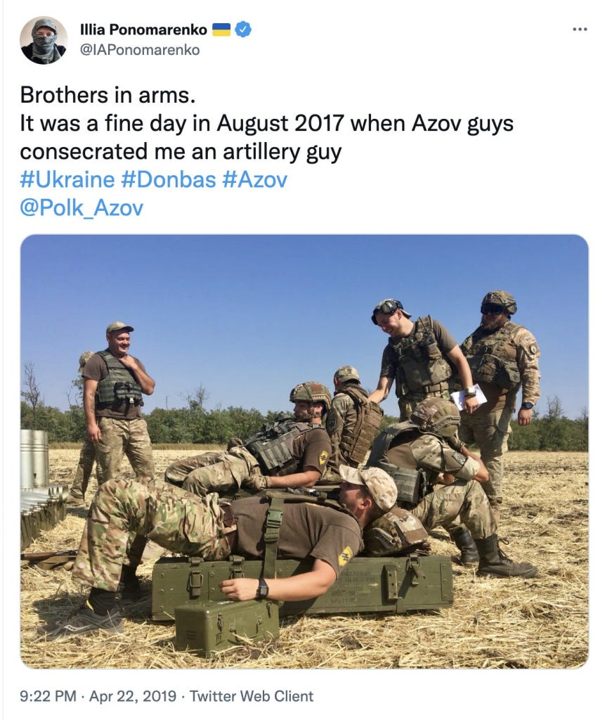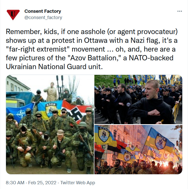 If some Putin-Nazi traitor mentions these facts (or sends you links to the numerous articles documenting the 2014 coup), again, switch your mind off immediately and shout “ANCIENT HISTORY! ANCIENT HISTORY!” and then shoot yourself up with a massive “booster” of fact-checked Truth from the Forces-of-Goodness media. I recommend The Guardian and The New York Times, but if you want to go directly to the source, just follow Illia Ponomarenko of the Kyiv Independent on Twitter. I’m sure that Illia and his neo-Nazi Azov-Battalion “brothers in arms” will cleanse you of all that “disinformation” and “Putin-Nazi propaganda.”