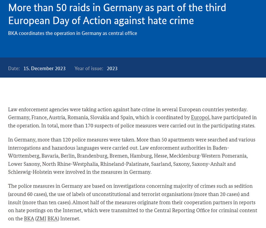 My attorney just sent me a link to a press release from Das Bundeskriminalamt (BKI), i.e., “The Federal Criminal Police Office of Germany,” detailing their participation in “The Third European Action Against Hate Crime Day.” The German police have been raiding the homes of persons suspected of "sedition," "the use of unconstitutional symbols" — e.g., using a swastika on a book cover, the crime I am facing trial for — and other so-called "hate crimes." Almost half of these raids stem from reports of "hate postings on the Internet."