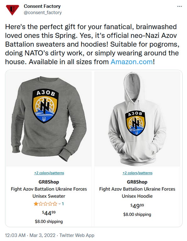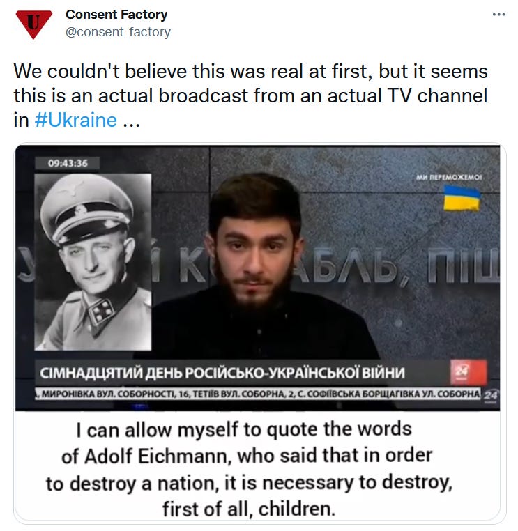 Or this Unherd piece by Aris Roussinous, explaining that arming and supporting neo-Nazis “may be one of the hard choices forced by war,” and advising Zelenskyy to disarm them once the war is over and “freedom” is restored … which, obviously, he intends to do. After all, the man is Jewish! He will probably ban the neo-Nazis outright, like he banned all the non-neo-Nazi parties.