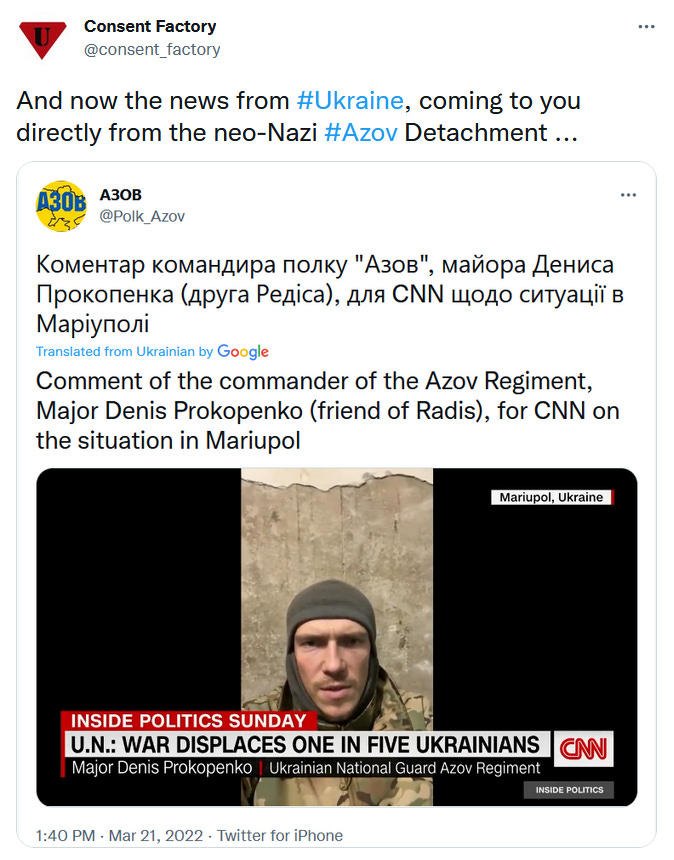 Or, if you prefer your propaganda less nuanced, you can go with CNN and get it straight from the source, for example, from Major Denis Prokopenko of the neo-Nazi Azov Regiment …