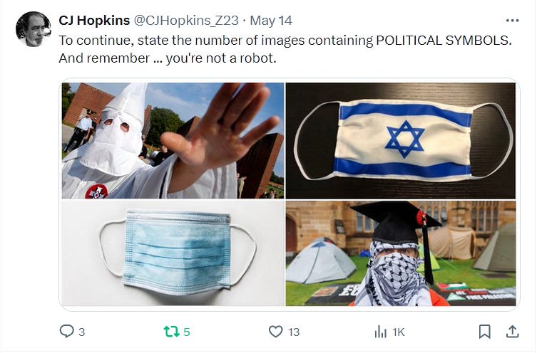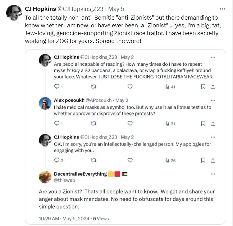 My unresponsive anti-authoritarian response did not sit well with Cardinal Cudenec, so he whipped out one of the Anti-Zionist Inquisition’s most feared and most ruthlessly efficient weapons, the Online Character Assassination. “Why is CJ Hopkins now devoting all his efforts to attacking critics of the Israeli genocide?” he shrieked. Could it be that CJ Hopkins is controlled opposition? Is he now, or has he ever been, a Zionist?