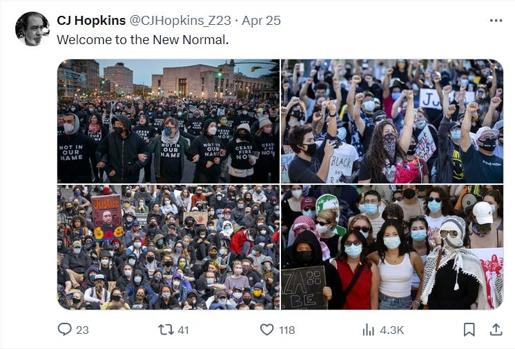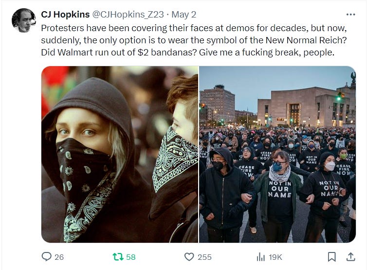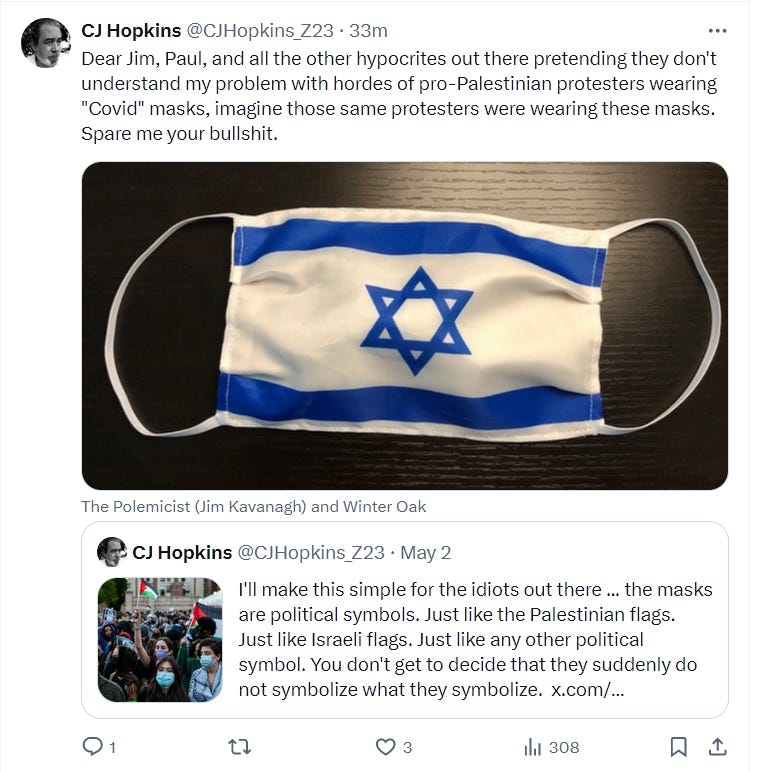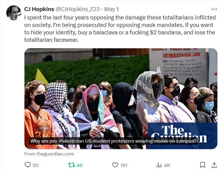 Yes, I’m speaking from personal experience, having recently survived a visit from the Anti-Zionist Inquisition on Twitter. What happened is, I noticed that the pro-Palestinian student protesters in the USA, or many of them, were wearing “Covid” masks. So I tweeted about it. Here are some of those Tweets …