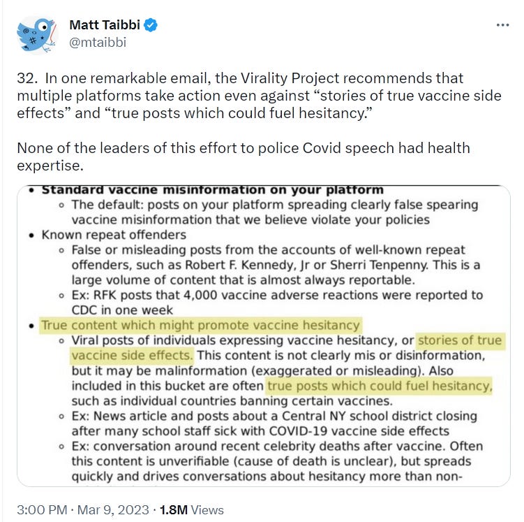 “We learned Twitter, Facebook, Google, and other companies developed a formal system for taking in moderation ‘requests’ from every corner of government: the FBI, DHS, HHS, DOD, the Global Engagement Center at State, even the CIA. For every government agency scanning Twitter, there were perhaps 20 quasi-private entities doing the same, including Stanford’s Election Integrity Project, Newsguard, the Global Disinformation Index, and others, many taxpayer-funded.” (Matt Taibbi’s Statement to Congress)