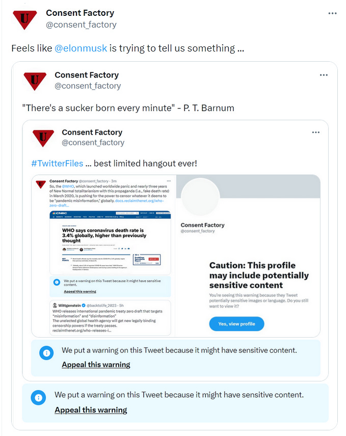 Another area that Matt and his Racket team will need to studiously avoid when digging through the “Twitter Files” that Elon Musk is granting them unrestricted and unconditional access to is any evidence of how the new Free-Speech Twitter is continuing, and actually intensifying, its visibility-filtering of political speech … especially political speech that does not fit neatly into a red/blue paradigm, or that reminds the public about how the Covid-PSYOP was a global PSYOP that was rolled out all at once, globally, and not just a series of “well-intentioned overreactions” and “mistakes,” and so on.
