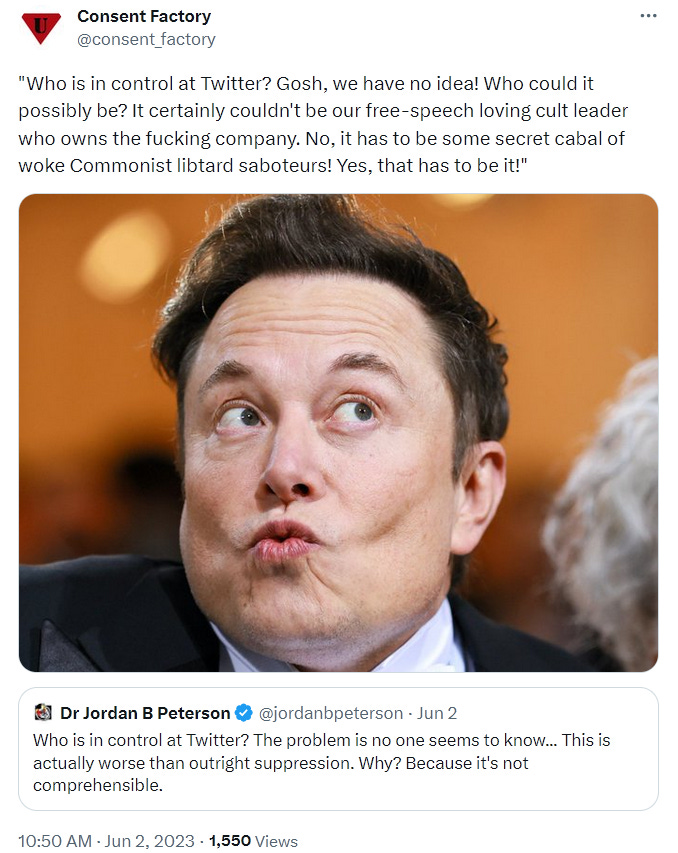 So, they’re taking it out on blasphemers like me who tried to warn them about The Emperor Elonicus, and how the Twitter Files was a textbook limited hangout, and who pointed out how Musk shut it down as soon as it had served its purpose, and who referred to some of them as “Musk cultists,” and “suckers,” and who tweeted sarcastic Tweets like this …