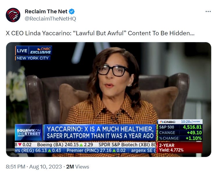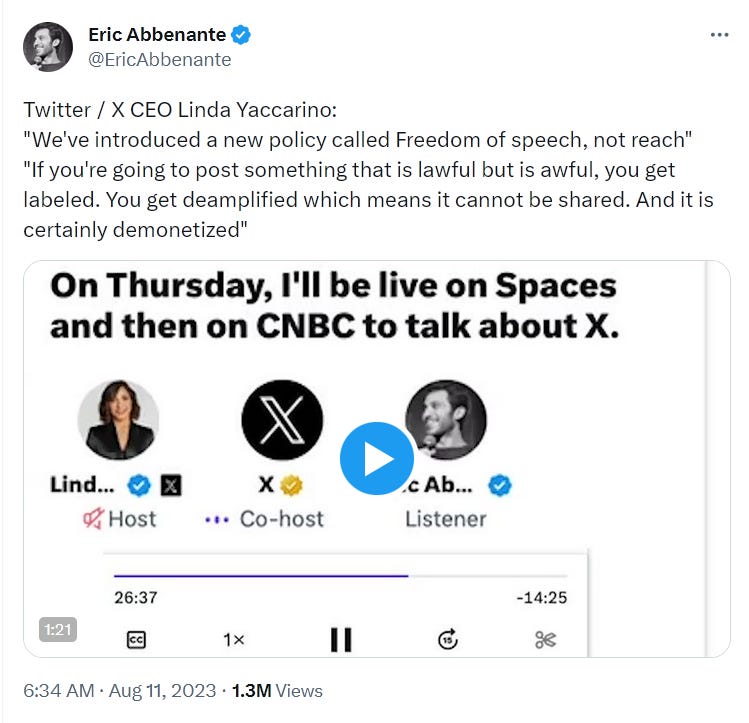 Here’s a link to that Tweet with a recording of the Spaces thing. It’s Linda Yaccarino, X CEO, explaining how the new censorship system works. And here’s my favorite Yaccarino quote: