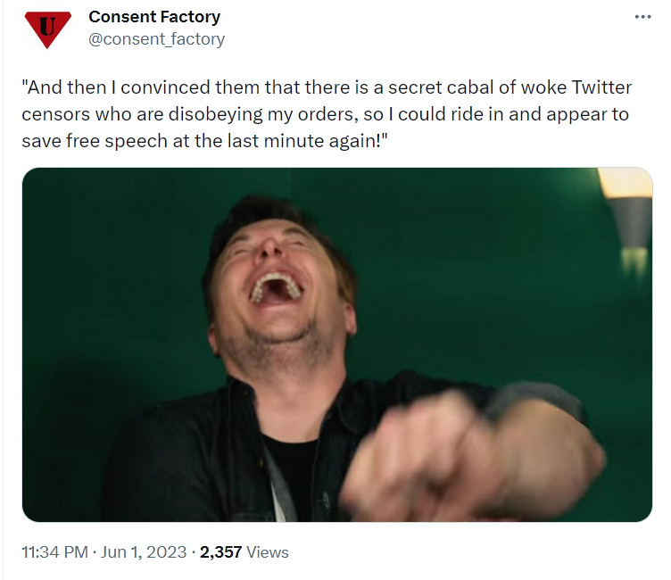 It’s amazing, isn’t it, how Elon Musk keeps saving free speech from his own fucking company? He’s like Captain America, Jesus Christ, and P.T. Barnum all rolled into one!