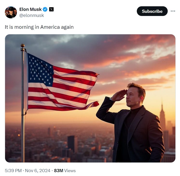 Which is why I’m going to wait a while before I publish anything serious on this topic. I’m kind of tired of pissing into the wind at the moment. Watching the actual potential resistance to the rollout of The New Normal Reich get captured, harnessed, and redirected back into the usual partisan-politics sideshow by Elon Musk et al. for the past two years has left me feeling a little disheartened, or disillusioned, or sad, or something.