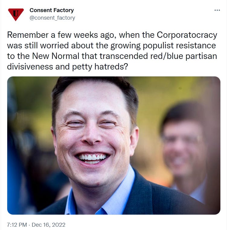 And this monumental story is being buried in shit … American red/blue partisan shit. With a series of ham-handed PR stunts, cheap provocations, attention-grabbing antics, and good old-fashioned diversionary shit-slinging, Musk is (a) whitewashing the new “free-speech Twitter,” which continues to censor and defame us with impunity, (b) burying the actual story under a steaming heap of partisan acrimony, and (c) driving a big blunt wedge into the supra-partisan coalition of forces that had aligned in opposition to the roll-out of the New Normal.