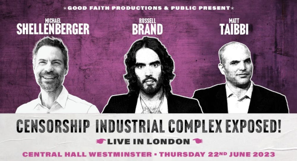 I’m going to be in London again next week. I’m attending this event where Michael Shellenberger, Matt Taibbi, and Russell Brand will be talking about the Censorship Industrial Complex, and what is to be done about it. I’ll also be meeting with some colleagues in London (you know, like, for tea, or whatever), and we are also going to talk about it, and what is to be done about it.