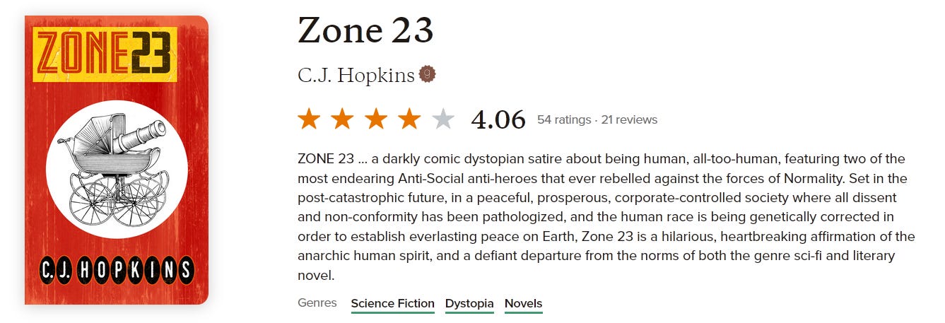 I am reading Zone 23 now, as a matter of fact. And liking it a lot. I'm also a novelist and I also sympathize with your feelings (however misplaced) that for some reason people are more interested in your nonfiction satire than your fiction satire. Fiction actually has more power to reach a broader audience. I will be reviewing Zone 23 on Dactyl Review. I said that before, but now I'm actually on it. Please make an audiobook, if you can, but in the meantime, if you care to be a guest on The Strange Recital, I will recommend you to my friends there.